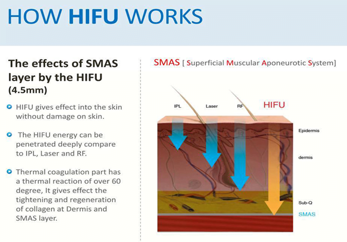 - SMAS layer (the muscular layer of the skin). Focused ultrasound tightens the muscular level of the skin